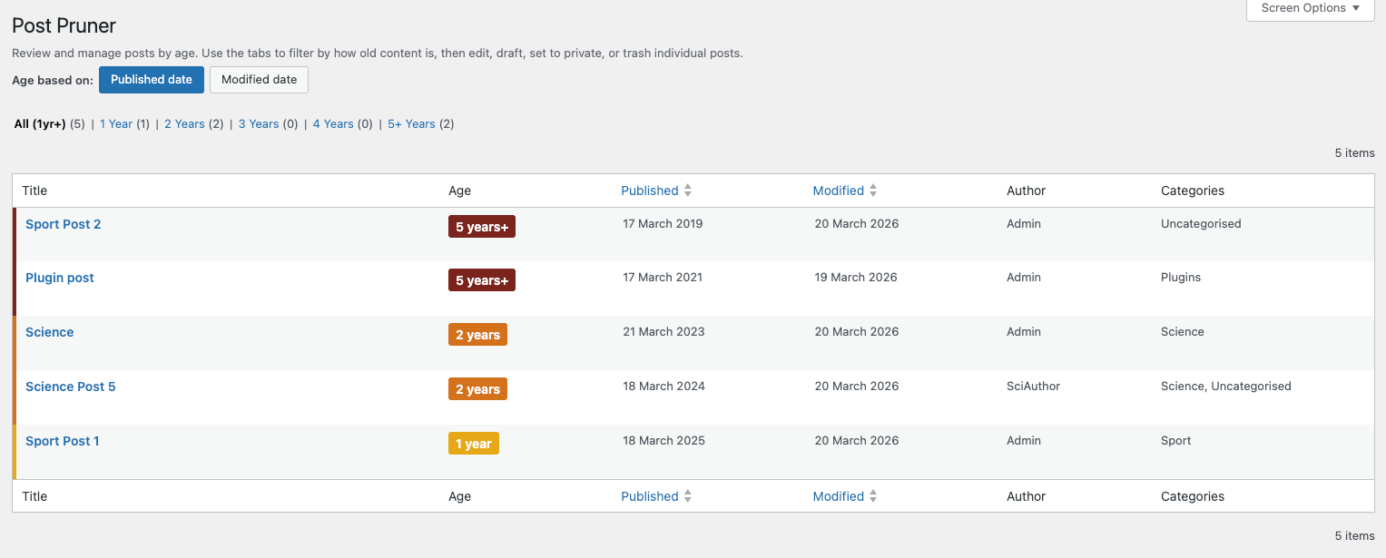 Age-based post management for WordPress. Find old posts fast, spot content that has never been meaningfully updated, and edit, draft, set to private, or trash posts from one screen. Completely free.